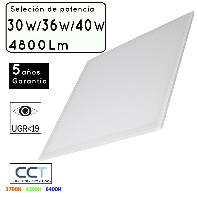 Panel LED de 595x595x30mm con tecnología 3CCT (3000K/4000K/6500K) y tres potencias seleccionables (30W/36W/40W). Ofrece 120lm/W, Ra80, driver LED flicker-free STARSENSE (PHILIPS) aislado. Diseño con difusor PS, marco y placa trasera de hierro en color blanco, con UGR<19 para menor deslumbramiento. Garantía de 5 años. Ideal para iluminación eficiente y profesional