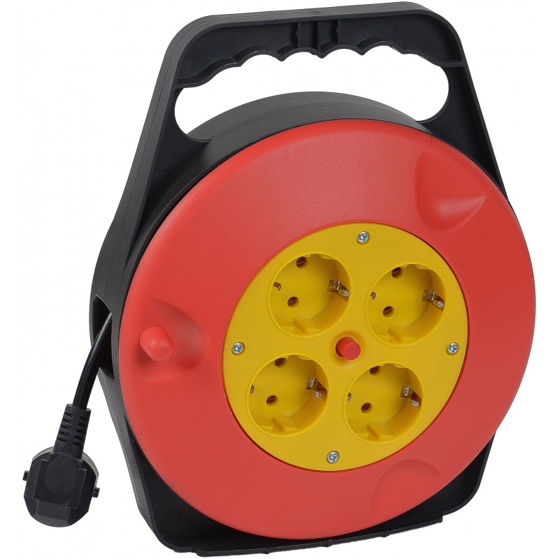 Carrete alargador de cable de tipo H05VV-F y sección 3x1,5mm² con una toma de corriente extensible de 10 metros y 4 enchufes del tipo German Socket.Desenrrollado soporta una carga máxima de 3200W Vatios mientras que la carga máxima con el cable enrollado es de 1100W.